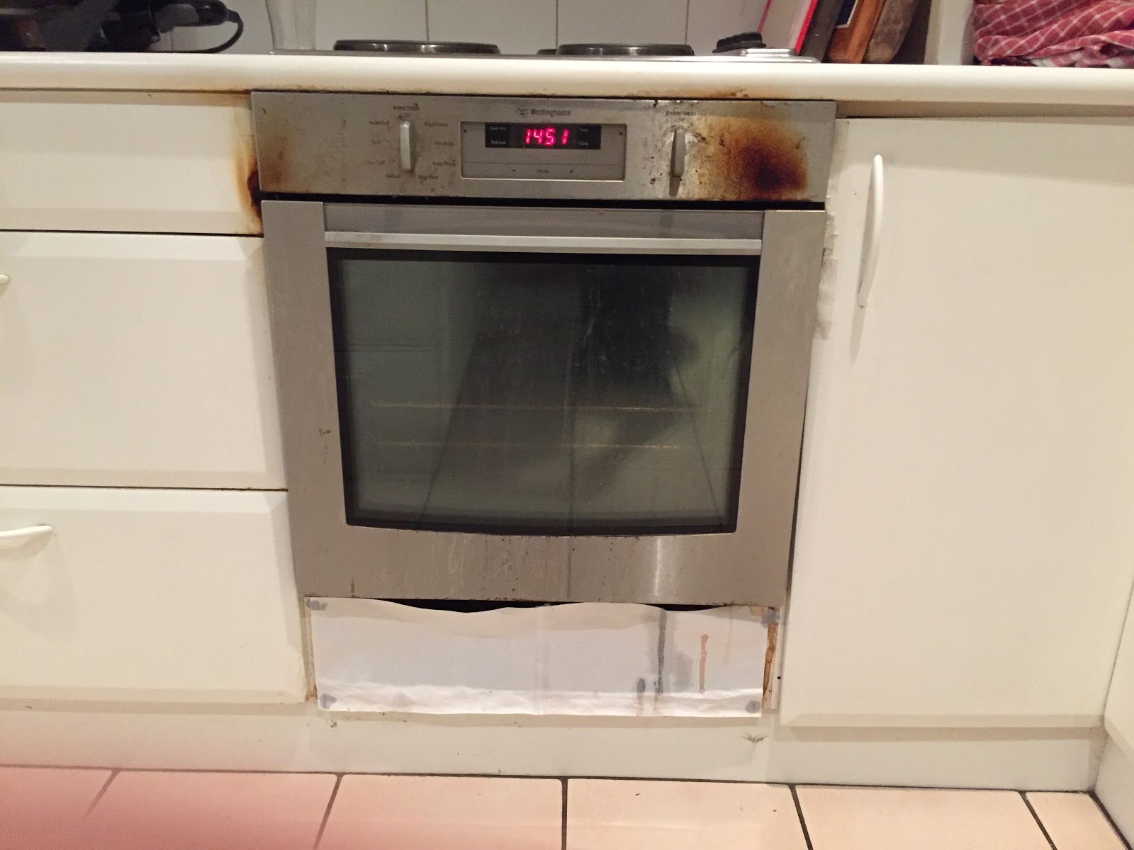 Yes, those are scorch marks around the edges of the oven, and a shabby looking piece of paper covering the hole at the bottom where the kickboard fell off. Should we be using paper near such a dodgy oven? Probably not. The cupboard on the right has duct tape on the top edge, to cover the melting.